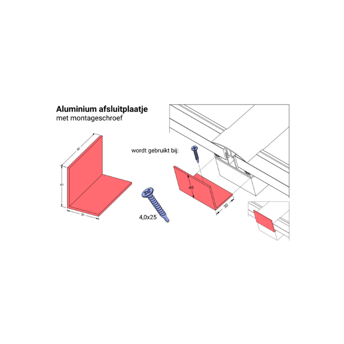 De aluminium hoekplaat met schroef wordt bij elk tussenprofiel geplaatst. De hoekplaat voorkomt ook het afschuiven van de kanaalplaten.